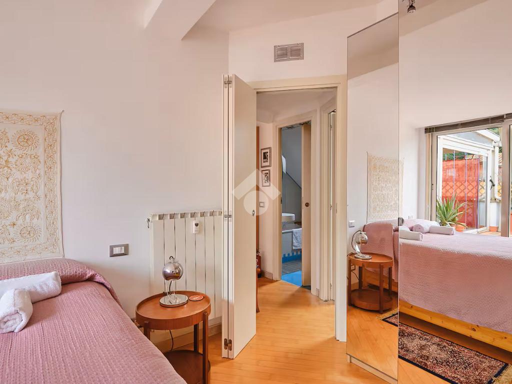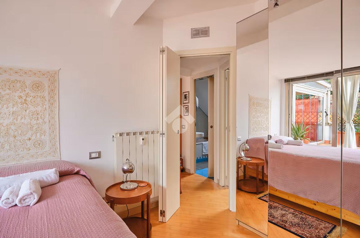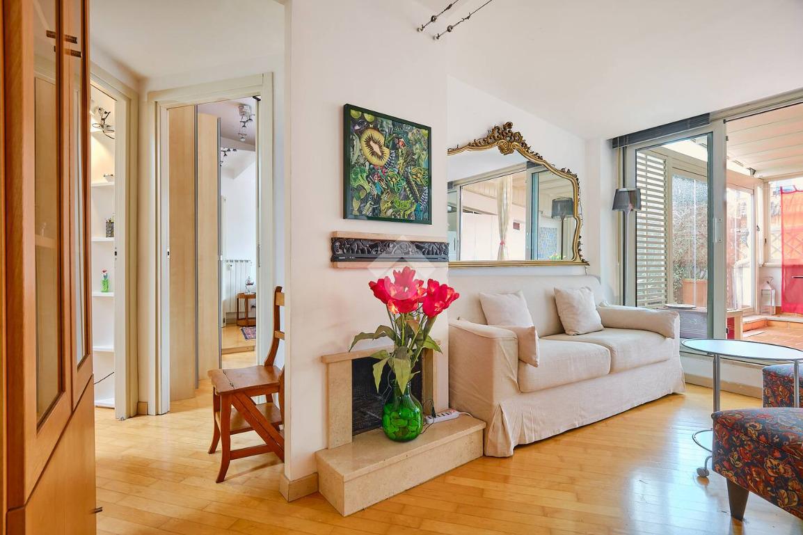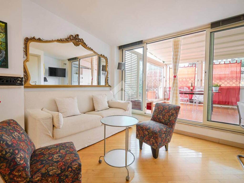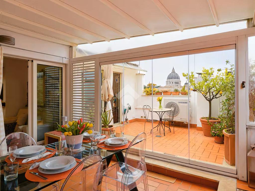 L’abitazione è posta al nono ed ultimo piano di una palazzina in ottimo stato, servita da ascensore fino all’ottavo piano. Si presenta come un appartamento dagli ambienti moderni e accoglienti: luminoso soggiorno dotato di camino funzionate ed accesso al grande terrazzo attrezzato con pergotenda chiusa con vetrate removibili, che crea un ulteriore spazio vivibile per pranzare e godere della zona giorno all’aperto, cucina funzionale e ben organizzata, camera da letto matrimoniale con accesso anch’essa al terrazzo con vista unica su San Pietro, cameretta/studio e servizio dotato di vasca e finestra.