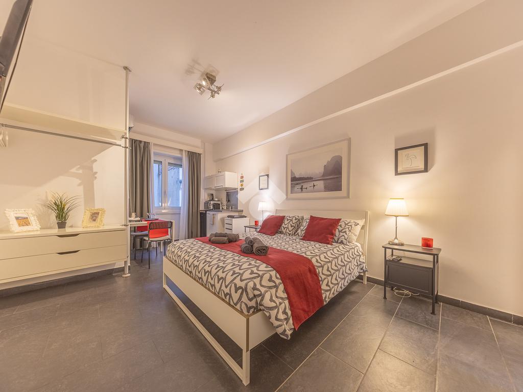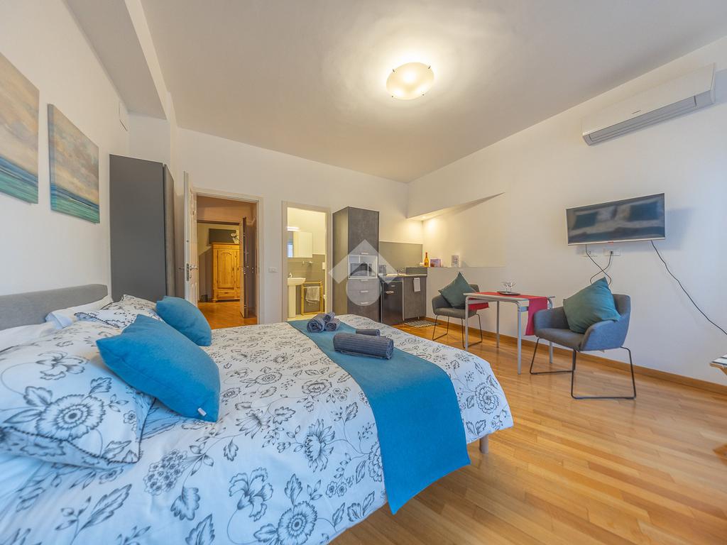 Sulla sinistra è presente il primo alloggio, composto da un’ampia camera, bagno finestrato con doccia e una piccola area attrezzata con mobile cucina.
