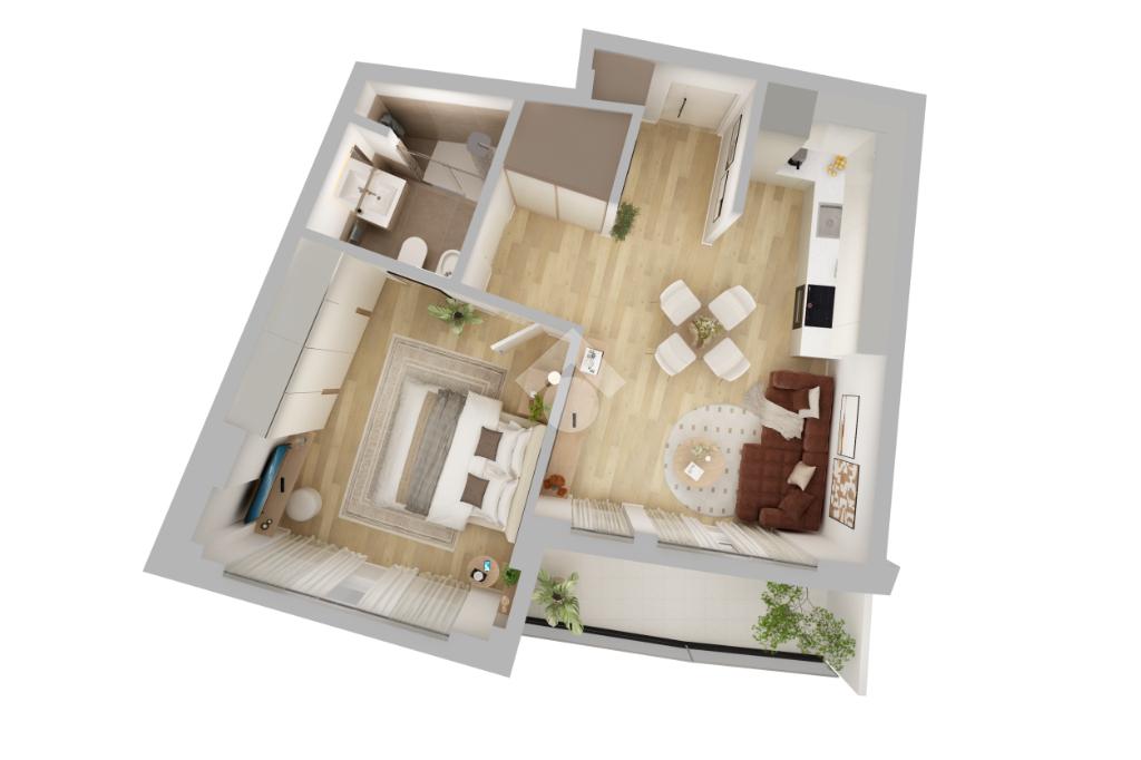 Si tratta di tre soluzioni distinte, ciascuna di circa 55 mq, pensate per offrire ambienti moderni, funzionali e pronti da vivere. Tutti gli appartamenti sono dotati di balcone e presentano una distribuzione interna moderna composta da soggiorno con angolo cottura, camera da letto e servizio.